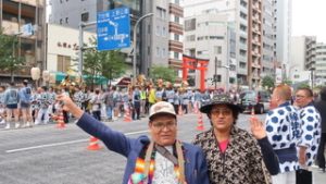 They luckily saw a parade of assisting in carrying various portable shrines (Mikoshi) on shoulders near their hotel ....